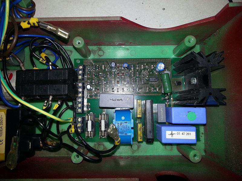 Finger weg vor solchen Experimenten, wenn man keine Ahnung hat. Durch die hohen Spannungen besteht Lebensgefahr!Nun zum letzten Beitrag von Peter: Ich dachte das Signal wäre eigentlich OK, ein gleichgerichteter Sinus, der PWM- moduliert ist, müsste auch ohne Glättung funktionieren. Wenn der Brückengleichrichter defekt wäre, würde ich annehmen, dass zumindest eine Halbwelle fehlt. Desweiteren finde ich keine Siebelko, der müsste bei den Spannungen und Strömen doch ziemlich fett sein oder? Hier ein Bild der Platine