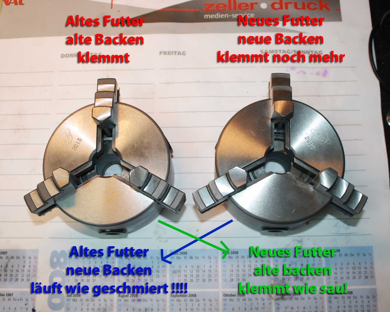 Also spinn ich. Nehme ich die alten Backen ins neue Futter, kriege ich die kaum reingedreht, wäre es eine Schraube, hätte ich Angst die würde abreißen.
