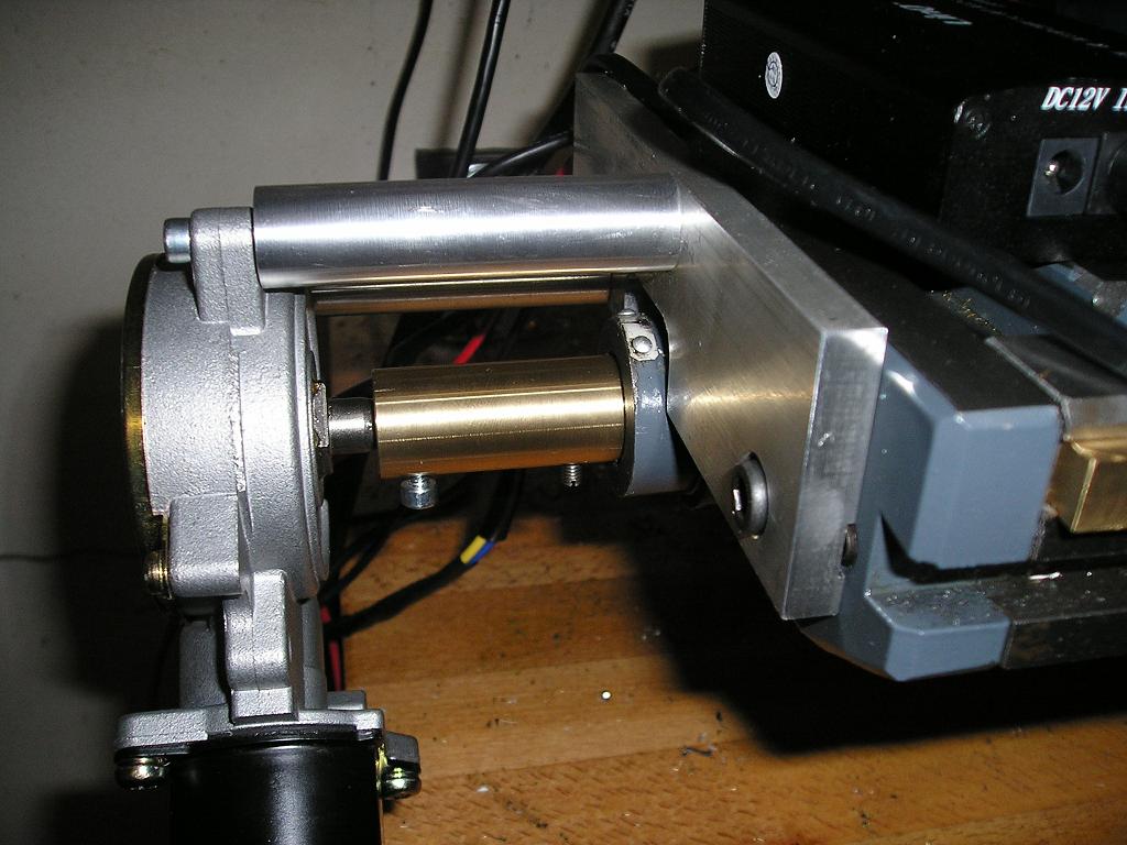 Ich habe den Motor über eine 8 mm Aluplatte am Tisch befestigt. Dazu habe ich die vorhandenen Bohrungen der Seitenplatte benutzt, also keine Bohrarbeiten oder Änderungen an der Maschine. Der Motor wurde dann über Distanzbolzen aus Aluminium an der Aluplatte befestigt. Die direkte Ankopplung an die Spindel erfolgt über eine gedrehte Messingbuchse. An der Spindel wird die Buchse mit einer M4 Inbusschraube in der Nut der Spindel geklemmt.