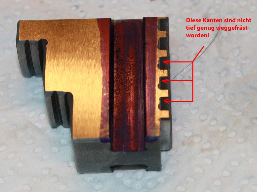 Habe diese Nasen dann mit einer Dreiecksschlüsselfeile bei beiden Backen rausgefeilt und dann nochmals getestet. Backe 3 gleitet nun auch sanft rein und raus. Backen 1 will immer noch nicht.
