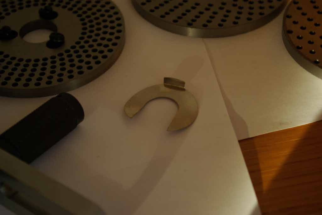Dann schiebe ich die "Kurbelhilfe" auf die Welle. Die ist wie eine Schere gebaut und verhindert solange sie geschlossen ist das Einrasten des gefederten Indexstiftes. Dann kurble ich in diesem Zustand, bis ich die gewünschte Teilung nach der Gradskala ungefähr erreicht habe, Schere auf und einrasten - bearbeiten, Stift wieder heraus, Schere zu u.s.w.
