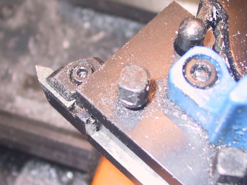 Für eine deutlich größere Nut in Alu habe ich ein angeschliffenes, nicht gehärtetes Stück Silberstahl benutzt, das Späne erzeugt wie beim Kartoffeln schälen (allerdings sollte man den Drehstahl sehr viel kürzer als im Foto einspannen).