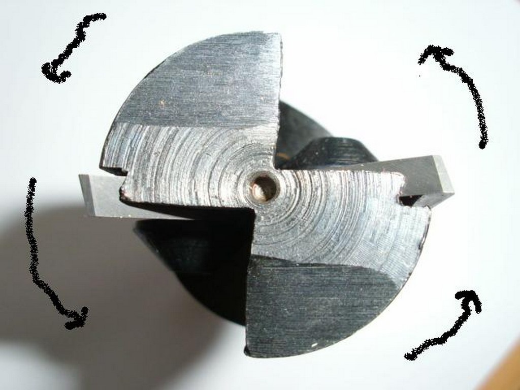 So wie deine Messer eingespannt sind, müsste der Fräser linksherum drehen, um zu schneiden und dabei die Messer gegen die Schraube drücken.