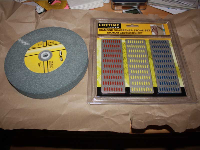 Einmal eine D200 80er Körnung Siliziumkarbid Scheibe für meinen Schleifbock und für das feine abziehen danach noch Diamant Abziehsteine in 3 Körnungen.
