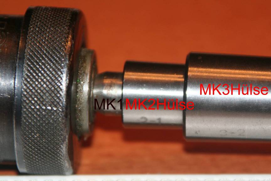 RE: Bohrfutter wechseln -aber wie? - Thunder - 03.12.2013 Leute ich habe jetzt ein ähnliches Problem. Wie bekomme ich ein B16 Futter aus dem Aufnahmedorn raus ? Hintergrund: Ich habe ein altes Röhm Supra geschenkt bekommen , leider ist da ein MK1 Konus drauf. Ich brauche aber MK3.Danke und Grüße Lars RE: Bohrfutter wechseln -aber wie? - 4-ventiler - 03.12.2013 Hallo Lars. (03.12.2013, 08:59)Thunder schrieb: Wie bekomme ich ein B16 Futter aus dem Aufnahmedorn raus ? Wie bereits beschrieben, mit Abrückkeilen oder besser mit der Abdrück-Gabel, ggfs kannst du auch einen (oder zwei) [alte] Gabelschlüssel nehmen die wie die Gabel üger den B-Kegel gehen, musst die Gabelspitzen evtl etwas anschleifen. Das Erwärmen per Föhn ist idR nicht erfolgreich, da der Temperaturfluss nicht intensiv genug ist und somit zu langsam, denn dann wird der Kegel genau so warm wie das Futter und es klemmt erst recht. Fallgewicht wie ein Gleithammer, das wäre ne Möglichkeit, wenn es sich ausführen ließe. Viel Erfolg und Tschüss RE: Bohrfutter wechseln -aber wie? - franz - 03.12.2013 (03.12.2013, 08:59)Thunder schrieb: leider ist da ein MK1 Konus drauf. Ich brauche aber MK3. was wäre mit sowas ![]() http://www.ebay.de/itm/Reduzierhulse-DIN-2185-MK-3-MK-1-/321162439700?pt=Werkzeug_Spannmittel&hash=item4ac6c5ec14 Grüße Franz RE: Bohrfutter wechseln -aber wie? - Thunder - 03.12.2013 Moin Leute, hier mal ein Bild vom Futter mit 2 Hülsen. Die ist echt keine Lösung. Die Abdrückgabel geht auch nicht, die bekommt man nicht hinter den MK1 Dorn, das rutscht immer ab. Meine Überlegung war schon den Drom absägen und ein Gewinde in den Stummel drehen und dann das ganze mittels einer Hülse rausziehen. Aber das muss doch auch nicht destruktiv gehen - oder doch nicht Grüße Lars RE: Bohrfutter wechseln -aber wie? - mech1 - 03.12.2013 Hallo Lars, du könntest die MK2-MK1 Hülse mit dem MK1 Dorn "verheiraten", indem du die Hülse ordentlich aufwärmst (~80° würd ich meinen) und als heißer auf den Dorn klopfst (gefühlvoll). Nach dem Abkühlen mit den Abdrückgabeln an der Hülse ansetzen. Mit etwas Glück geht der B16-Kegel dann raus. Das Risiko besteht natürlich, dass die Hülse nicht mehr vom MK1 runtergeht. Bist du sicher, dass es ein B16 Kegel ist, der da auf dem MK1 drauf ist? Die Einschnürung am MK1 find ich eigenartig. Gruß Werner RE: Bohrfutter wechseln -aber wie? - Thunder - 03.12.2013 (03.12.2013, 19:20)mech1 schrieb: Bist du sicher, dass es ein B16 Kegel ist, der da auf dem MK1 drauf ist? Die Einschnürung am MK1 find ich eigenartig. Hi Werner, ja stimmt sieht eigenartig aus. auf dem Futter steht B16, also gehe ich mal davon aus, das es eins ist. Oder kann das auch was andere heißen ![]() Grüße Lars RE: Bohrfutter wechseln -aber wie? - 4-ventiler - 03.12.2013 Hallo Lars: (03.12.2013, 18:04)Thunder schrieb: hier mal ein Bild vom Futter mit 2 Hülsen. Die ist echt keine Lösung. Du sollst ja auch keine zwei Hülsen nehmen , sondern Mk1/MK3 .(03.12.2013, 18:04)Thunder schrieb: Meine Überlegung war schon den Drom absägen und ein Gewinde in den Stummel drehen und dann das ganze mittels einer Hülse rausziehen. Aber das muss doch auch nicht destruktiv gehen - oder doch nicht Wenn du definitiv weißt, dass der Dorn innen weich ist, doch die MK-Kegel gibt es durchhart oder im Zentrum immer noch so zäh dass kein Gewinde zu schneiden geht. (Ich habe selbst grad son Fall, haben bereits 2-Widiabohrer dran glauben müssen und bin noch nicht durch und von wegen Gewinde keine Chance.) Dass eine Orig Abdrückgabel nicht gehen soll kann ich nicht verstehen, sieht zwar etwas eigenartig aus der B Kegel, doch wenn auf dem Futter steht B16, dann sollte das mit der Abdrückgabel gehen – es sei denn, das hat mal einer zusammengefügt nach Werners Methode .(03.12.2013, 19:20)mech1 schrieb: Hallo Lars, Also, 80° genügen sicher nicht, aber der B16 und der MK1 bleiben dann auch sicher verheiratet! Mit ner Orig-Gabel, da würde ich mich fast wetten getrauen mit dir, dass ich das Scheide! Tschüss 4-Ventiler RE: Bohrfutter wechseln -aber wie? - Balu - 03.12.2013 Hallo Zusammen, hat der MK 1 ein Gewinde ? wenn ja: Gleithammer oder du steckst ein Rohr über den MK und schraubst dann eine lange Schraube in den MK. Mit einer Mutter und einer Unterlage auf dem Rohr kannst du nun versuchen das Futter abzudrücken. Grüße Volker RE: Bohrfutter wechseln -aber wie? - mech1 - 04.12.2013 (03.12.2013, 21:57)4-ventiler schrieb:(03.12.2013, 19:20)mech1 schrieb: Hallo Lars, Hallo Miteinander, @Lars B16 am Bohrfutter it eindeutig, mich wundert nur der dünne Hals am MK1. Ist aber möglicherweise für die Abdrückgabel. Ist da ev. eine Reduzierhülse B16-B10 im Bohrfutter eingesetzt? Gesehen habe ich so eine Reduzierung allerdings noch nie. @Erwin hast du schon mal ein kaltes (Raumtemperatur) MK-Werkzeug in eine warme Spindel (gut handwarm) fest eingesetzt und später mal probiert das Werkzeug wieder rauszukriegen? Dann stell dir vor, wie das mit 80°C hält. Wieso sollte der B16 von der Aktion betroffen sein? Das verstehe ich nicht, was du da meinst. Was spricht dagegen, dass Lars es mal so probiert? Gruß Werner RE: Bohrfutter wechseln -aber wie? - Thunder - 04.12.2013 Ein Gewinde für den Anzug in einer Fräsmaschine hat der Dorn leider nicht - das wäre ja zu einfach. Diese Vermutung,dass hier nochmal eine Reduzierhülse im B16 Dorn sitzt hatte ich auch schon, das alles irgendwie komisch aus. Meine Adrückgabel passt definitv nicht. Ich werde probieren ob der Dron druchgehärtet ist oder ob ich da doch ein Gewinde reinbekomme. Grüße Lars |