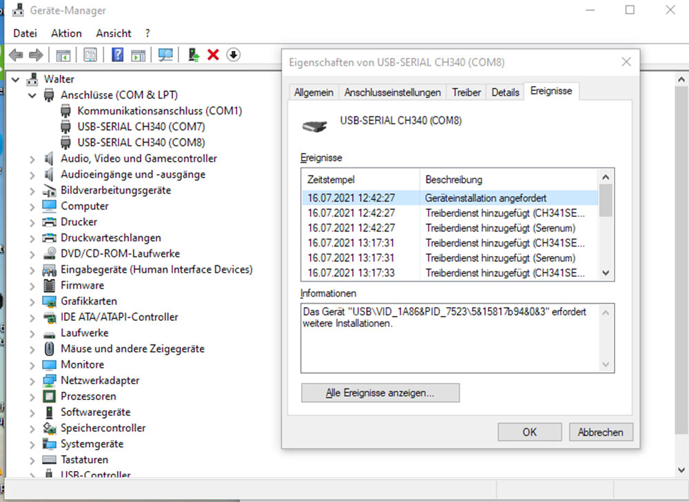 RE: Eine Gravierfräse muss her, nur wie vorgehen ? - walter - 16.07.2021 Servus Allemiteinand Zitat:Hi Walter, Servus Viktor Danke für den Input, das mit dem anschließen habe ich gemacht, windows 10 reagiert auch prompt, nur der Nano ist nirgends zu finden. Wie du siehst ist ein Kontakt da und die Led leuchtet grün, die Led rechts daneben blinkt allerdings rot. Im Gerätemanager ist vom Nano auch nichts zu erkennen. @Franz Also deinen Link habe ich ausprobiert und der Upload scheint zu funktionieren. Wobei ich befürchte das wieder eine Schnitzeljagt wird. Am Montag will ich alles mit einem Forumskollegen zusammenbauen und wenn dann ein Teil nicht richtig funktioniert, dann bekomme ich eine Krise. Hat den wer von euch einen Link zu einem Original Arduino Nano, für mich als Frischling erscheinen alle gleich und ich kann das Original vom Nachbau nicht auseinander halten. Bzw.....ist das ein Original https://www.reichelt.at/at/de/arduino-nano-v3-atmega-328-mini-usb-arduino-nano-p142943.html?PROVID=2807&gclid=CjwKCAjw3MSHBhB3EiwAxcaEuz1ULWUWr6C_RlSUfHyHFKP5YfBkFvS3bORSZvp4vnGqgI7pylDMyhoCVGoQAvD_BwE In diesem Sinne vielen Dank an alle die sich hier an der Diskussion beteiligen. L.G. Walter RE: Eine Gravierfräse muss her, nur wie vorgehen ? - VDX - 16.07.2021 Hi Walter, ... was sind die COM7/8? - steck den Nano an, laß dem etwas Zeit und zieh ihn dann wieder ab, ob sich bei den COM-Ports was ändert ... Viktor RE: Eine Gravierfräse muss her, nur wie vorgehen ? - walter - 16.07.2021 (16.07.2021, 17:32)VDX schrieb: Hi Walter, Servus Viktor Das habe ich jetzt gemacht und es ist der Port 8 siehe Screenshot. Mehr weiß ich jetzt nicht. L.G. Walter RE: Eine Gravierfräse muss her, nur wie vorgehen ? - frajo - 16.07.2021 Hallo Walter, der Arduino von Reichelt ist der Originale. Jetzt muss noch in der Arduino Software der Arduino Typ Nano und Port 8 eingestellt werden. Erst dann ist der Nano mit dem PC verbunden und Software kann übertragen werden. Siehe meinen Beitrag oben. Grüße, Franz RE: Eine Gravierfräse muss her, nur wie vorgehen ? - LazyBee - 16.07.2021 Hallo Walter, einer Deiner "USB-Serial CH340" (COM7) oder (COM8) ist Dein Arduino. Nun musst Du die Entwicklungsumgebung Arduino IDE starten. Gehst anschließend unter Werkzeuge und wählst das richtige Board aus: Jetzt den Port auswählen (bei Dir 7 oder 8): und den richtigen Bootloader auswählen (ATmega 328P). Ich habe die Billigversion und benötige dafür oft den "OldBootloader" Jetzt kannst Du probeweise mal ein kleines Programm wie schon vorgeschlagen testen. Ich hoffe, dass Dich das weiter bringt. Gruß RE: Eine Gravierfräse muss her, nur wie vorgehen ? - walter - 17.07.2021 Vielen Dank an LazyBee an die umfangreiche Hilfestellung. ![]() Irgendwie hatte ich das gestern schon richtig gemacht nur den falschen Port ausgewählt. ! Der Stand der Dinge ist folgender: