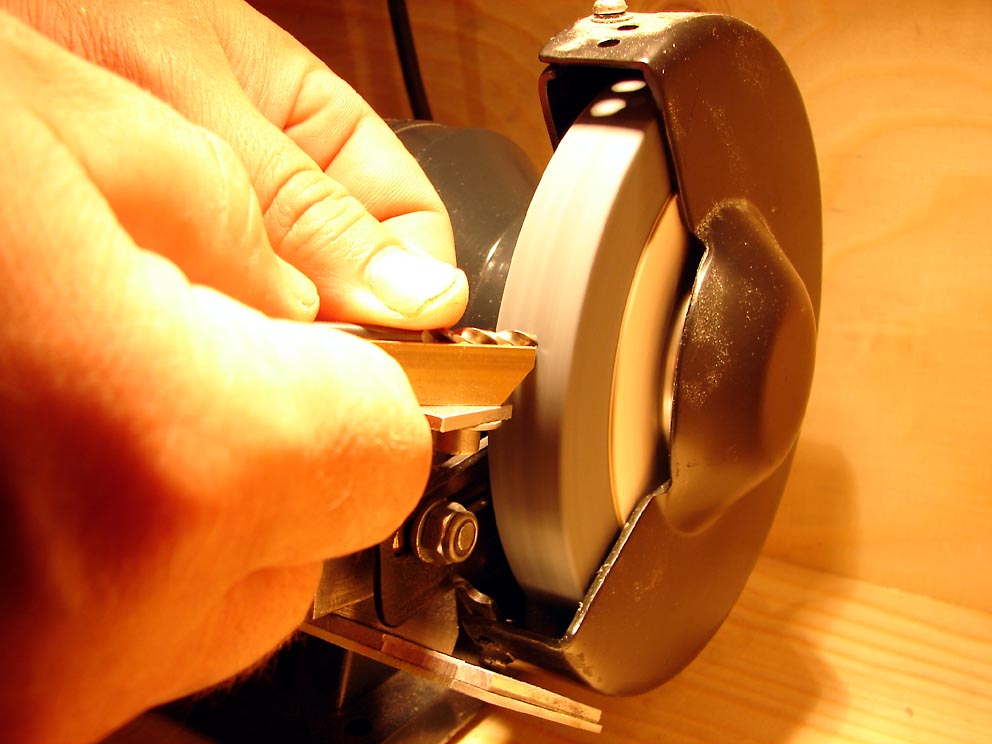 Die Achse des Bohrers peilt ungefähr 5mm über Drehachse der Schleifscheibe. Das ergibt den nötigen Freiwinkel