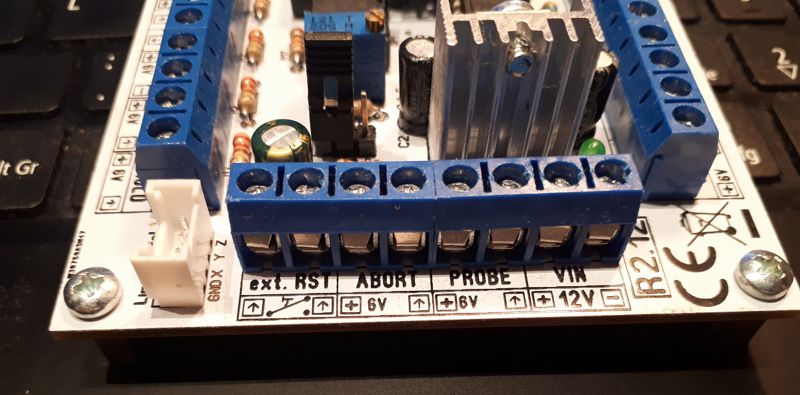 Die Testplatte dürfte "Probe" sein, die Spindel-Drehzahl dürfte über den Ausgang "Inverter" geregelt werden ... Notaus habe ich bei den vorigen Anlagen meist über ein Relais, das die Endstufen und ggf. auch den Controller stromlos schaltet -- bei deinem Board hast du auch den Eingang "Externer Reset", den du zum Zurücksetzen des Controllers verwenden kanst.