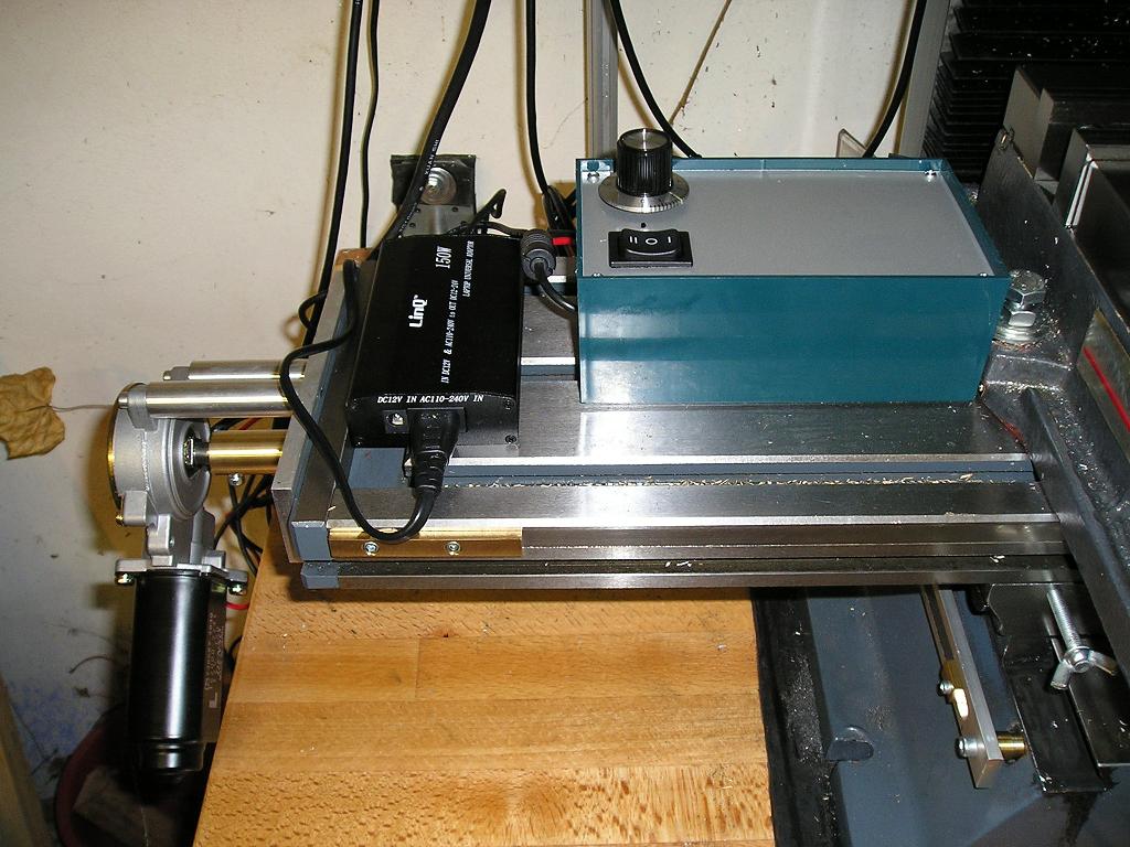 hier mal 2 Bilder vom Vorschub der BF 20 zusammen mit dem Netzteil und der Steuerung. Der Steuerungskasten ist leider recht groß geworden, da die Platine die Maße 90 mm * 110 mm hat.