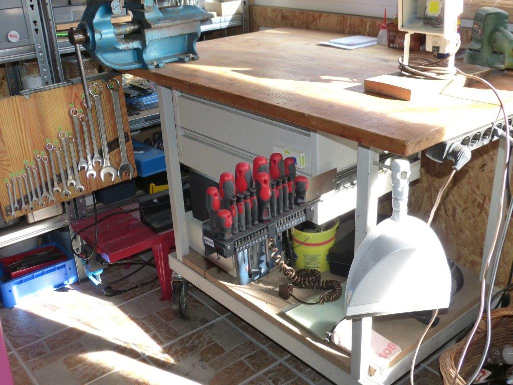 Auf der rechten Seite ist der Ständer des gekauften Schraubendreher Satzes angeschraubt. Damit können diese Werkzeuge schnell zugänglich jederzeit aus dem Weg geräumt werden.