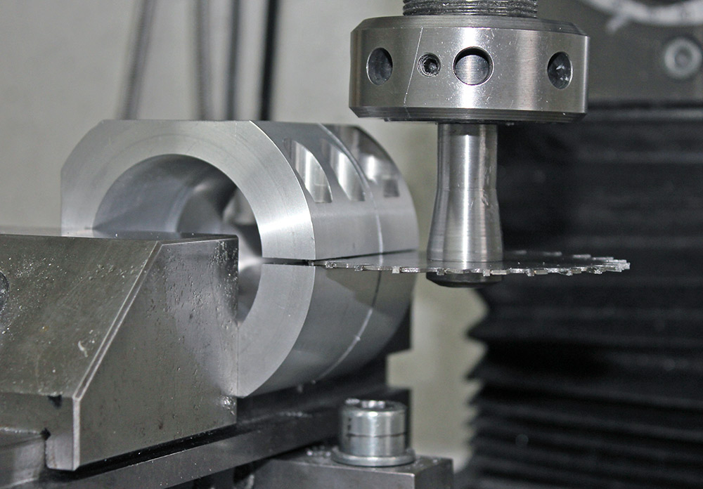 Innen so weit ausdrehen, bis der Schlitz erreicht ist. Teil aus der Maschine ausspannen, Schrauben lösen (damit das Teil sich entspannt).